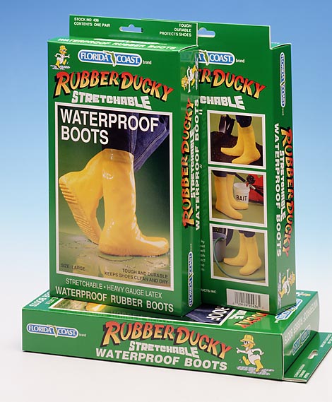 Florida Coast Rubber Ducky Boots are packed in an attractive display box, ready for shelf, rack or peg board placement: complete with U.P.C. Code. Four color photographs show varied uses and wide market appeal.